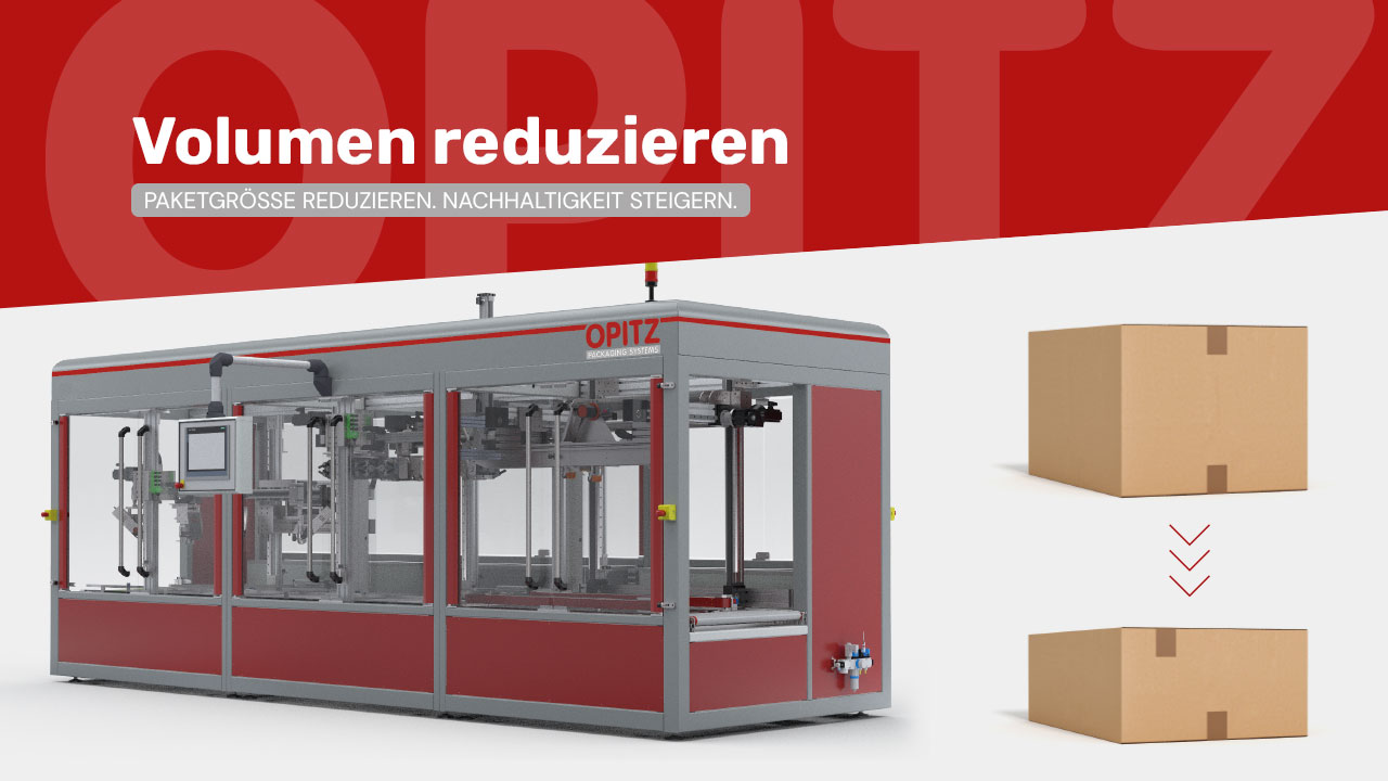 Der patentierte Karton-Volumen-Reduzierer AMI von OPITZ macht Ihren Verpackungsprozess zukunftsfähig. Die Anlage passt mit Produkten befüllte Kartons vollautomatisch auf ihre minimal notwendige Größe an und verschließt sie sicher für den Transport.